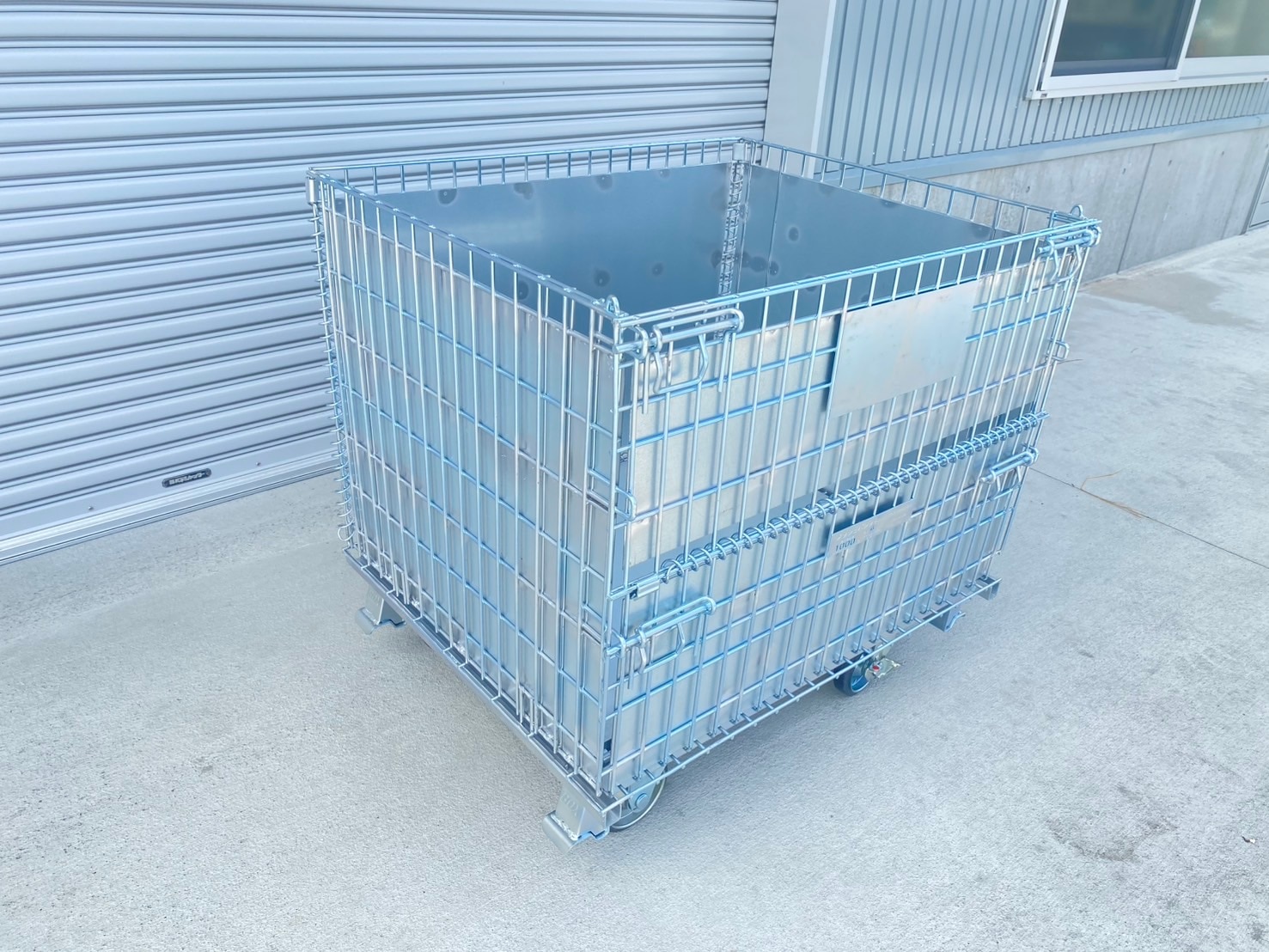 大型メッシュパレットM1510の商品を、吊上げ出来る様に、U字フックを4か所と上端部補強加工しました。お客様からのヒヤリングから約500kgを中にいれて吊上げしたいとのご要望でした。